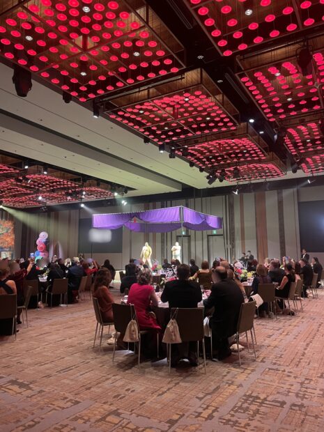 On a specially designed stage styled like a sumo ring, a traditional Japanese "Kanpai" ceremony; sake barrel-breaking was performed to celebrate the opening of the party.
